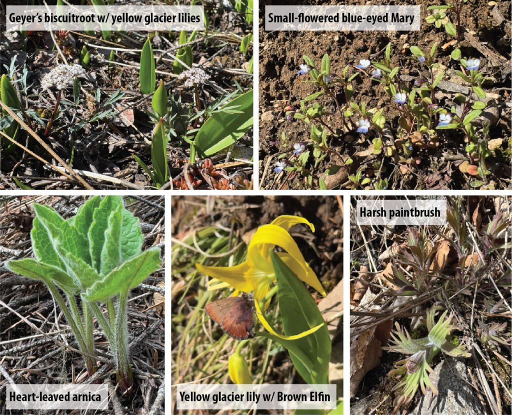 • Dwarf waterleaf (Hydrophyllum capitatum) – In bloom soon. Super special plant and hard to find (look for it near large patch of yellow glacier lily).
